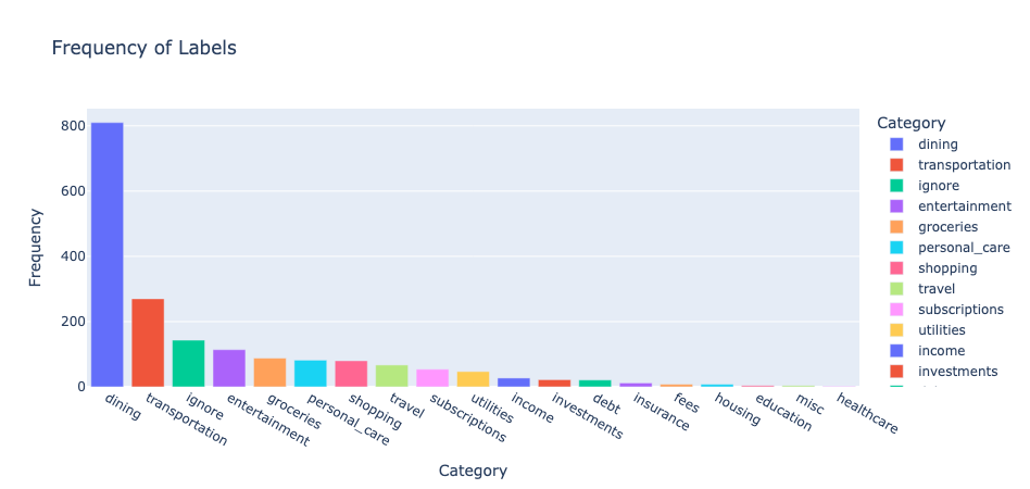 The motivation behind this project is to be able to easily create a budget based on how much I am spending on a regular basis. Although many institutions have good budget categorizers, I, like many other individuals, use multiple banks and apps for my finances. As a result, I wanted a centralized location that I could use to aggregate my transaction data and gain insights from it as a whole. Plus, the model would only see my data and so it will be customized for myself, which should allow it to better categorize my transactions.