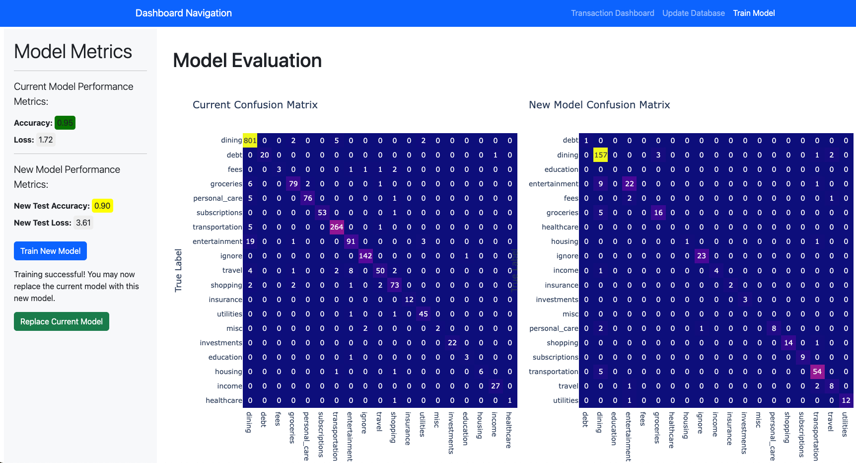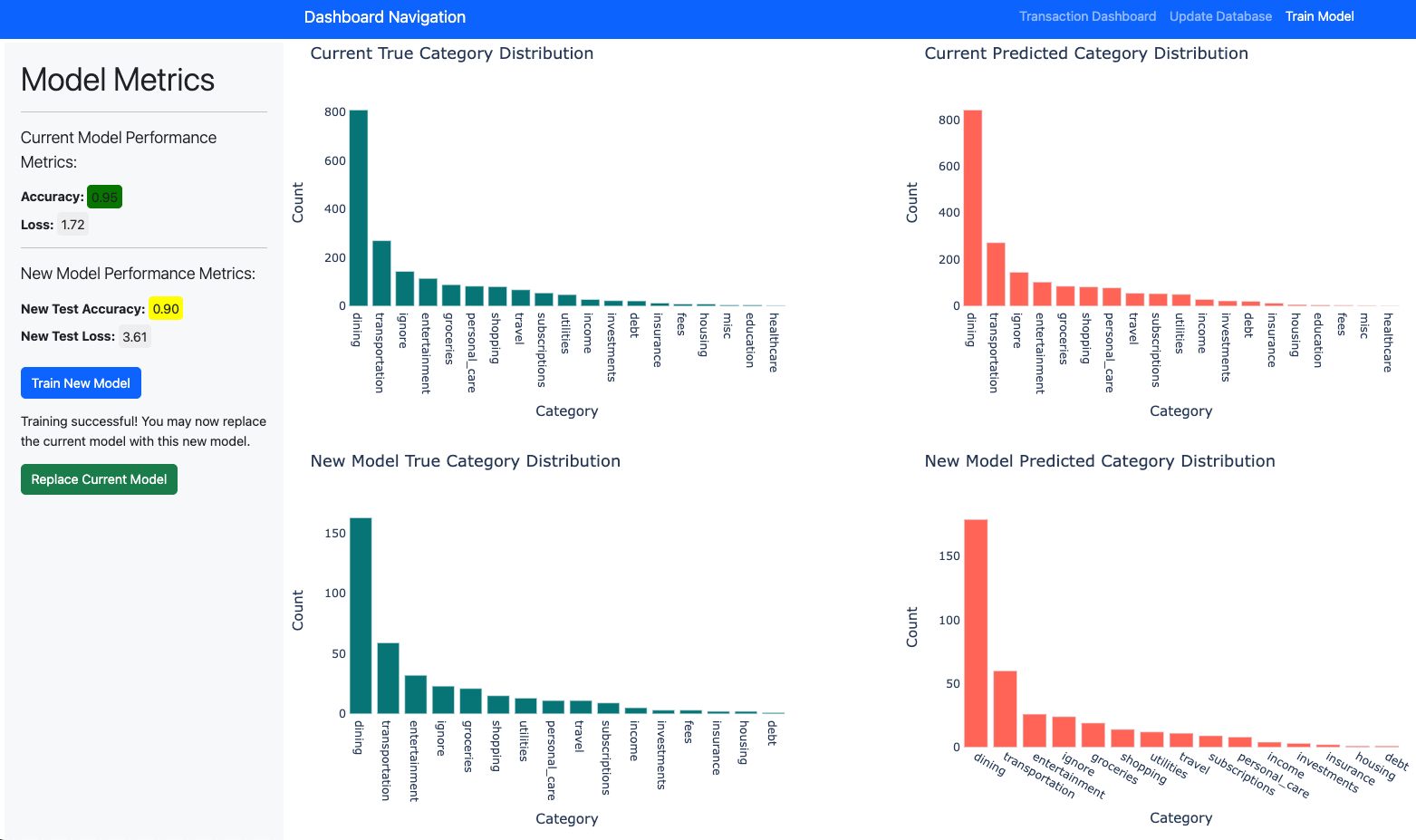 With the model now determined, I now wanted a way to centralize the data. As a result, I decided to use a locally hosted Dash App in order to visualize my transaction data by category, store any new data into the SQLite database, create predictions from new data, easily label any new data, and train my model to improve its performance over time. For this project page, I will not be going in depth with the coding and I will just be giving a high level overview of the app itself. To review the code, run the app.py module or open the \pages directory to see the code for the different pages on the app.