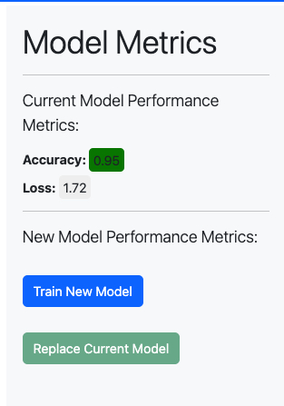The sidebar now shows the Current Model Performance in terms of the total accuracy and loss. The user can thus press the Train New Model button which will go about the process of training a model. Once the model is trained, a new confusion matrix, test accuracy, and test loss will be displayed as seen in the picture above. Also, when the new model is trained a message will appear and the Replace Current Model button will be enabled (you can see how the button is disabled prior to training in the picture below). The user can then select that button to save the new model in a \current_model directory, thus replacing it. If the user does not want to replace the model, they simply need to refresh or exit the page.