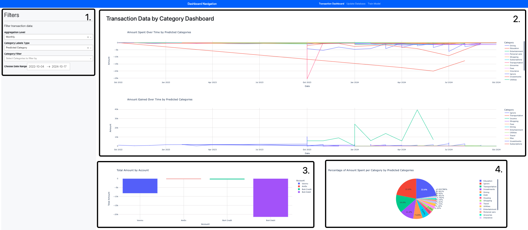 The Aggregation Level filter is used for the time trend and it aggregates the transaction amounts into different levels. The levels are monthly, weekly, daily, or yearly. The Category Labels Type is to either see the categorical spending based on the model’s predctions (Predicted Category) or based on my own personal categorization (True Category). As a note, if I did not label a transaction, it will not show up on the dashboard until I label the data. This is much easier to do for Predicted Category as we will get to when we move onto the update_database_page. Next, we move onto the Category Filter this will allow me to choose certain categories to see further data more in depth. By default, I see all the categories. Finally, the Choose Date Range filter will allow me to modify the max and min time period to view the data. By default, it chooses the max and min dates in the database and the filter will not allow the user to look at data beyond that range.