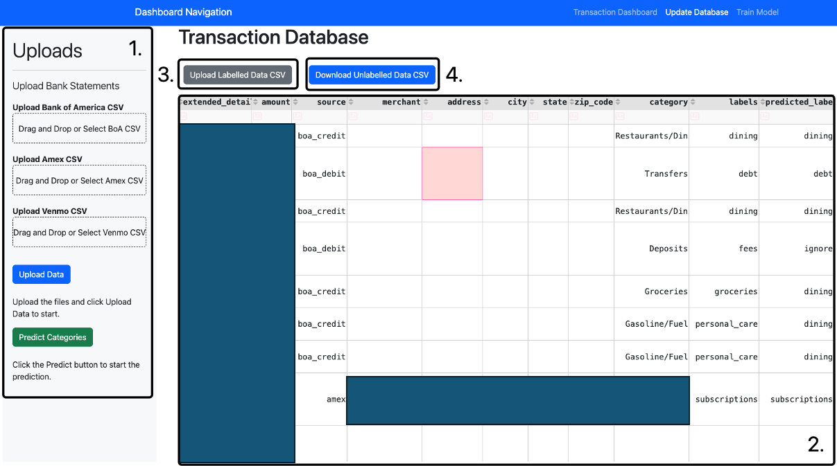 Finally, sections 3. and 4. is to update the labels column of the data. Now, you only need to do this if you are looking to retrain your model or want updated accuracy numbers. The Download Unlabelled Data CSV button (labelled as number 4.) will download any rows where the labels column is null into a .csv file. The user will then label the data by typing which transaction goes into which category. Once completed, the user will then press the Upload Labelled Data CSV and select the labelled transaction data. This will then update the database based on the transaction_id, which the user can review after they refresh the page.