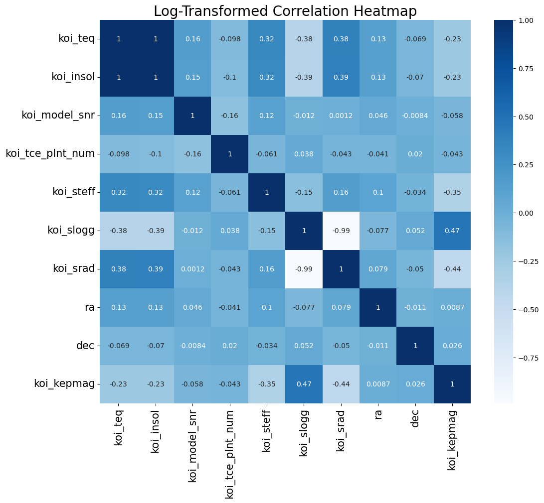 From here, I replotted the heatmap with the log transformed values along with the pairplot. As seen from the pairplot most of the distributions were now more visible and some of the features had a more normal distribution. Also, after log transformation, we see that koi_teq and koi_insol were now nearly linear after log transforming all the features. This is further emphasized in the correlation heatmap, which shows that koi_teq and koi_insol have a 1.0 correlation with one another. Investigating these two variables further, the NASA data dictionary does state that the koi_teq is the equilibrium temperature of the object while the koi_insol is the insolation flux, or the radiation heatflux of the object. This makes sense as the heat flux caused by radiation is proprotional to the Temperature to the fourth power (q ⍺ T4). As a result, when we log transformed both variables, we get a perfectly linear relationship.