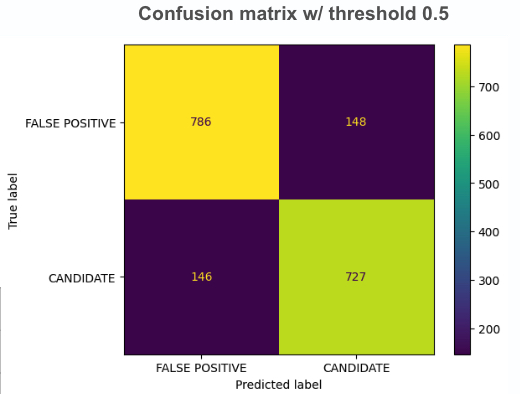 Going back to the original goal, our task was to expedite the process of exoplanet classification; however, I thought that mislabeling the Candidate class as a False Positive class would lead to a much more serious impact, since then astronomists would have to rereview the candidate and false positive classes. As a result, we decided to decrease the decision threshold (from an initial threshold to 0.5). While this would make the Candidate class accuracy worse, it would ultimately improve our False Positive Accuracy and prevent misclassification of potential exoplanets getting scrapped into the False Positive Bin.